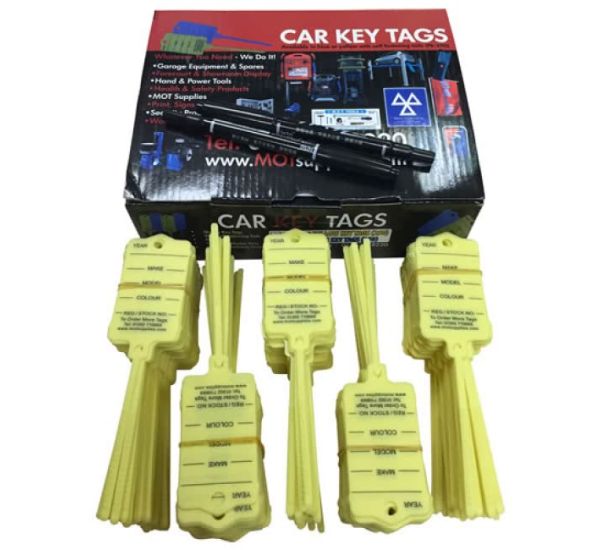 - Premium All Purpose Plastic Key Tags with Plastic Tails for quick use - Box 250 in Yellow Stiff, durable yellow vinyl plastic key tags with plastic tails Complete with 2 Fine Marker Pens Our key tags give you the "Professional Look"