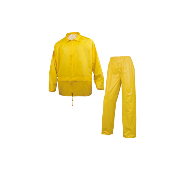 - JACKET: Fastening with zip under storm flap Fixed hood Raglan sleeves and adjustable cuffs with press-studs 2 x Pockets TROUSERS: Elasticated waist Adjustable bottom of legs with press-studs 2 x Hand slits