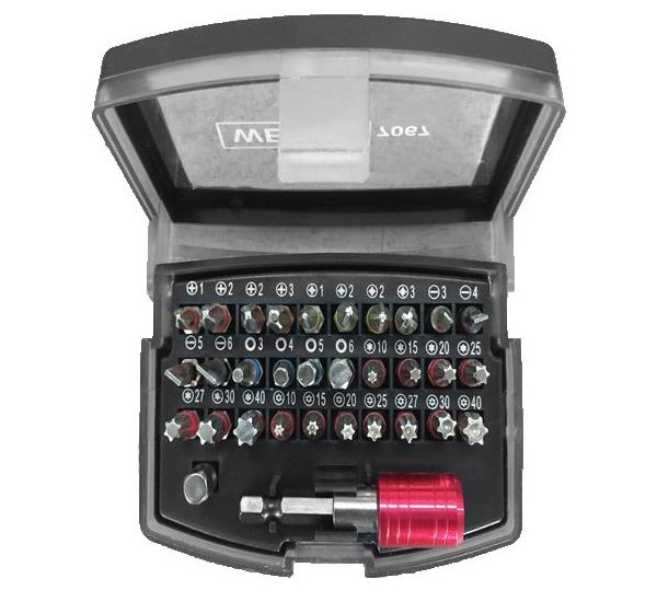 - 32-piece Colour-Bit-Set intelligent colour guide, one colour for each profile includes the following tools: 30 bits, length: 25 mm plain slot 3-4-5-6 mm cross slot PH1 - PH2 - PH2 - PH3 cross slot PZ1 - PZ2 - PZ2 - PZ3 Internal hexagon 3 - 4 - 5 - 6 mm T-Star (for Torx) T10 - T15 - T20 - T25 - T27 - T30 - T40 T-Star tamperproof (for Torx): T10 - T15 - T20 - T25 - T27 - T30 - T40 1 bit adaptor 1 quick chuck bit holder Material: S2