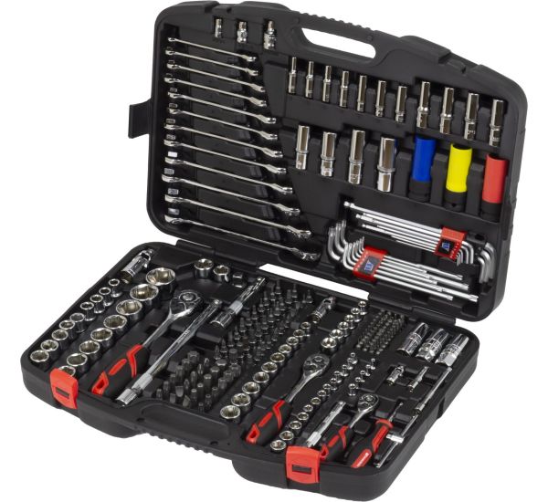 - drive 6.3 mm (1/4'') and 12.5 mm (1/2'') 3 serrated reversible ratchets, 72 teeth Includes: tools with drive: 6.3 mm (1/4'') 1 reversible ratchet 13 sockets 4 - 4.5 - 5 - 5.5 - 6 - 7 - 8 - 9 - 10 - 11 - 12 - 13 - 14 mm 7 sockets, deep, 4 - 5 - 6 - 7 - 8 - 9 - 10 mm 5 E-type sockets E4 - E5 - E6 - E7 - E8 1 bit adaptor with retaining ball | internal square 6.3 mm (1/4'') - internal hexagon 6.3 mm (1/4'') 1 extension bar 50 mm 1 extension bar 100 mm 1 universal joint 1 spinner handle 150 mm 1 sliding t-bar 33 bit sockets tools with 10 mm (3/8'') drive 1 reversible ratchet 10 sockets 10 - 11 - 12 - 13 - 14 - 15 - 16 - 17 - 18 - 19 mm 6 sockets, deep, 10 - 11 - 12 - 13 - 14 - 15 mm 6 E-type sockets E10 - E11 - E12 - E14 - E16 - E18 1 extension bar 125 mm 1 spark plug wrench 18 mm 1 universal joint 1 adaptor for 8 mm bits: tools with 12.5 mm (1/2'') drive 1 reversible ratchet 17 sockets 10 - 11 - 12 - 13 - 14 - 15 - 16 - 17 - 18 - 19 - 20 - 21 - 22 - 24 - 27 - 30 - 32 mm 2 sockets, deep 16 - 18 mm 2 E-type sockets E20 - E24 1 extension bar 250 mm incl. sliding bar 1 extension bar 125 mm 2 spark plug sockets 16 + 21 1 adaptor for 8 mm bits 1 universal joint 3 impact sockets 17 - 19 - 21 bits with 8 mm (5/16'') drive 6 bits T-Star (for Torx) T40 - T45 - T50 - T55 - T60 - T70 6 bits T-Star tamperproof (for Torx) TH40 - TH45 - TH50 - TH55 - TH60 - TH70 4 cross slot bits PH3 - PH4 / PZ3 - PZ4 3 slotted bits 8 - 10 - 12 mm 5 bits internal hexagon H7 - H8 - H10 - H12 - H14 9 Allen keys T-Star tamperproof (for Torx) T10 - T15 - T20 - T25 - T27 - T30 - T40 - T45 - T50 9 Allen keys internal hexagon 1.5 - 2 - 2.5 - 3 - 4 - 5 - 6 - 8 - 10 mm 12 ratchet wrenches 8 - 9 - 10 - 11 - 12 - 13 - 14 - 15 - 16 - 17 - 18 - 19 bits with 6.3 mm (1/4'') drive 10 T-Star (for Torx) T5 - T6 - T7 - T10 - T15 - T20 - T25 - T27 - T30 - T40 8 T-Star tamperproof (for Torx) T7 - T10 - T15 - T20 - T25 - T27 - T30 - T40 5 splines (for Ribe) M5 - M6 - M7 - M8 - M9 3 splines M5 - M6 - M8 8 T-Star (tamperproof with five star): TS10 - TS15 - TS20 - TS25 - TS27 - TS30 - TS40 - TS45 2 cross slots PH: PH3 - PH4 2 PZ cross slots: PZ3 - PZ4 2 internal hexagon H2 - H2.5 Allen keys, extra long, internal hexagon/internal hexagon with ball point in fold-out holder 1,5 mm - 2 mm - 2,5 mm - 3 mm - 4 mm - 5 mm - 6 mm - 8 mm - 10 mm Allen key set, T-Star (for Torx)/T-Star tamperproof (for Torx) T10 - T15 - T20 - T25 - T27 - T30 - T40 - T45 - T50 12 ratchet wrenches 8-9-10-11-12-13-14-15-16-17-18-19 mm