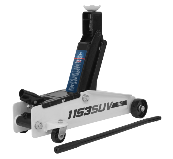 - Long chassis, high capacity, portable garage jack for serious hobby or recovery vehicle use. • Suitable for SUVs, cars or light commercial vehicles which require high ground clearance. • Tough pump bracket and heavy-duty one-piece hydraulic unit with safety overload valve. • Adjustable saddle height for use with vehicles that require a higher lifting range. • Supplied with one-piece pumping handle with rubber grip.