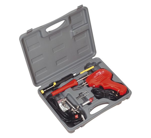 - * Comprehensive kit comprising: 100W soldering gun, 30W soldering iron, iron holder, excess solder extractor, scraper, spare tips, solder wire and universal workpiece clamps.