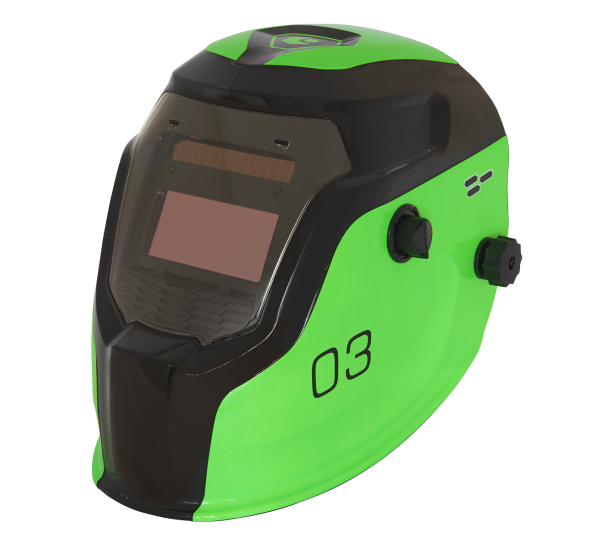 • • Welding helmet with infinitely adjustable shade control between 9-13. • Complies with BS EN 379, BS EN 175 and DIN standards. • True colour technology for improved depth perception, allowing far greater welding precision. • Fully automatic switching from light to dark on striking arc. • Shade is selected by a rotary knob on side of helmet. • Grinding function enables user to grind without removing mask. • Solar panel power supply - no batteries required. • Features sensitivity and delay controls for switching light to dark. • Suitable for MIG, TIG, arc welding and grinding Grinding Function: Yes Nett Weight: 535g Operating Temperature: -5°C to +55°C Operating Time Light/Dark: 0.04ms Power: Solar Cells Shade Active: 9-13 Variable Shade Inactive: 4 Viewing Area: 92x42mm