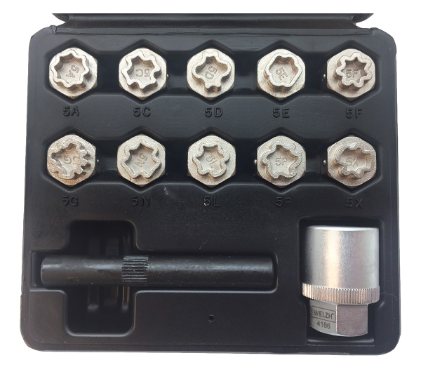 • Contains 10 locking nut sockets, adaptor and mandrel. Suits Mercedez Benz. Supplied in storage case.