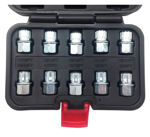 - Wheel Nut Lock Set - BMW-10pc • For the installation & removal of locking wheel nuts on BMW vehicles • Sizes Include: B11 / 15 ribs, B12 / 14 ribs, B13 / 16 ribs, B14 / 12 ribs , B15 / 11 ribs, B16 / 10 ribs, B17 / 7 ribs, B18 / 13 ribs, B19 / 8 ribs, B20 / 9 ribs Item Number: 4020-WW